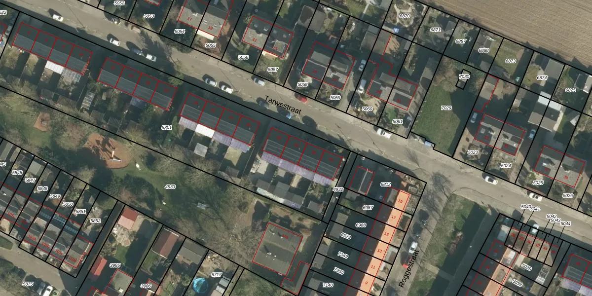Het perceel waarop Tarwestraat 30 staat heeft een oppervlakte van 3133 m². Dit is een zeer groot perceel. De perceeloppervlakte wordt geregistreerd door het Kadaster. Gedetailleerde informatie over de maten van dit perceel kunt u vinden in het rapport Kadastrale kaart met maatvoering van Tarwestraat 30.