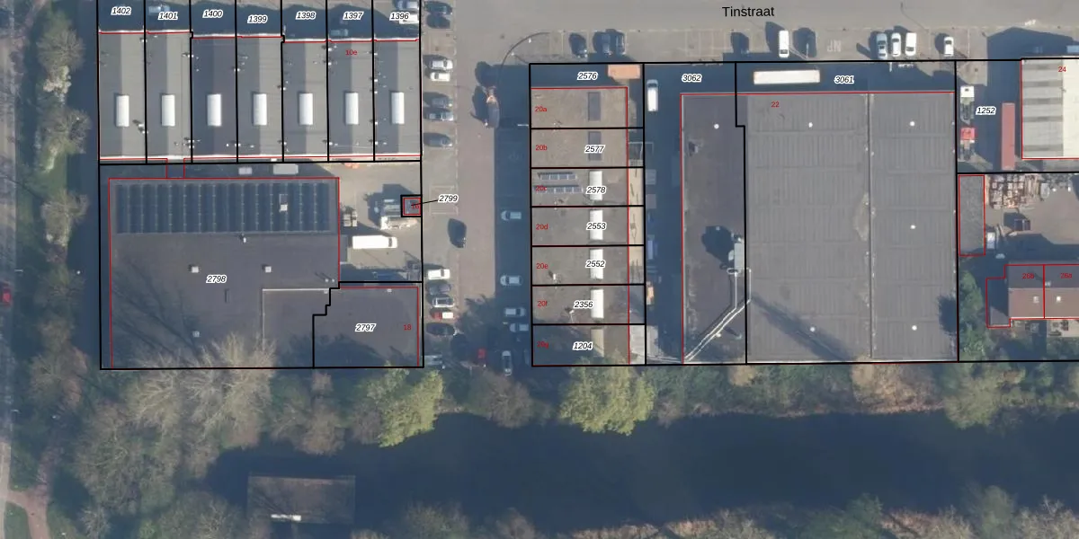 Tinstraat 20-e is gelegen op kadastraal perceel RDK01B2552. Deze kadastrale aanduiding is uniek en wordt gebruikt door het Kadaster om eigendomsrechten en andere zakelijke rechten vast te leggen. Het perceel maakt onderdeel uit van de kadastrale gemeente Ridderkerk.