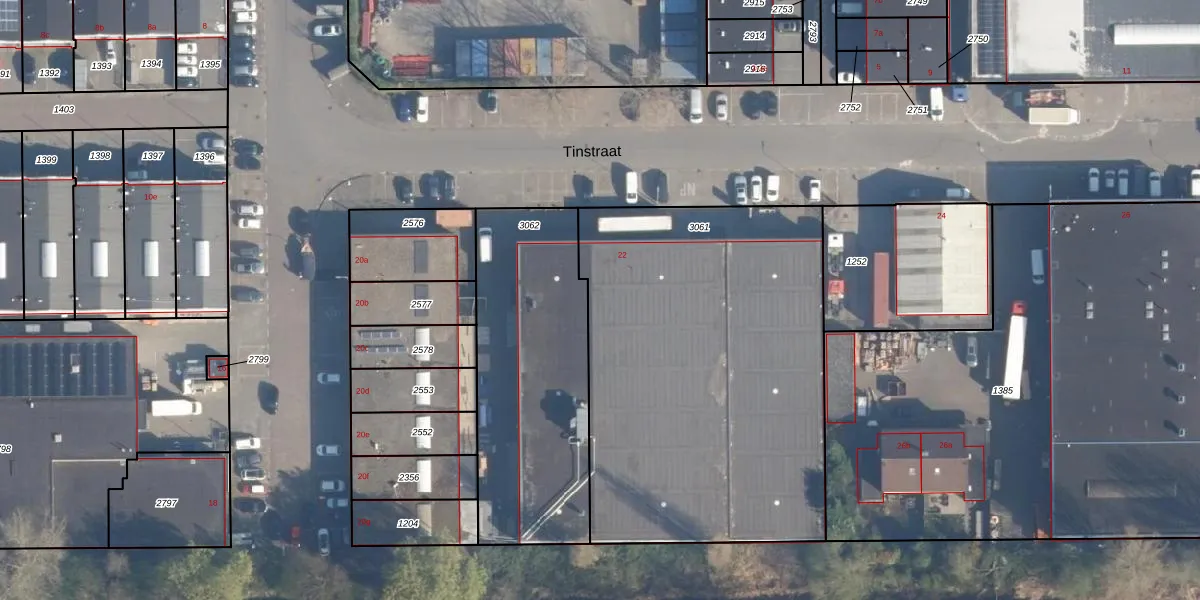 Het perceel waarop Tinstraat 22-m staat heeft een oppervlakte van 2215 m². Dit is een zeer groot perceel. De perceeloppervlakte wordt geregistreerd door het Kadaster. Gedetailleerde informatie over de maten van dit perceel kunt u vinden in het rapport Kadastrale kaart met maatvoering van Tinstraat 22-m.