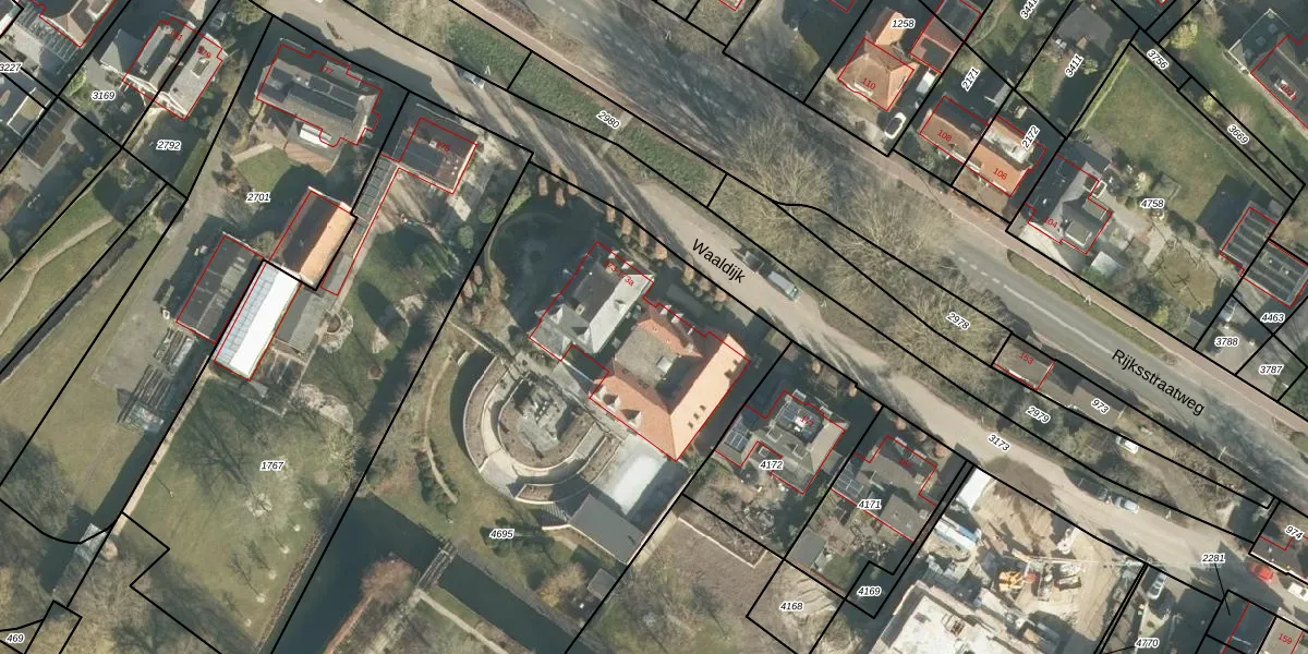 Het perceel waarop Waaldijk 173 staat heeft een oppervlakte van 4600 m². Dit is een zeer groot perceel. De perceeloppervlakte wordt geregistreerd door het Kadaster. Gedetailleerde informatie over de maten van dit perceel kunt u vinden in het rapport Kadastrale kaart met maatvoering van Waaldijk 173.