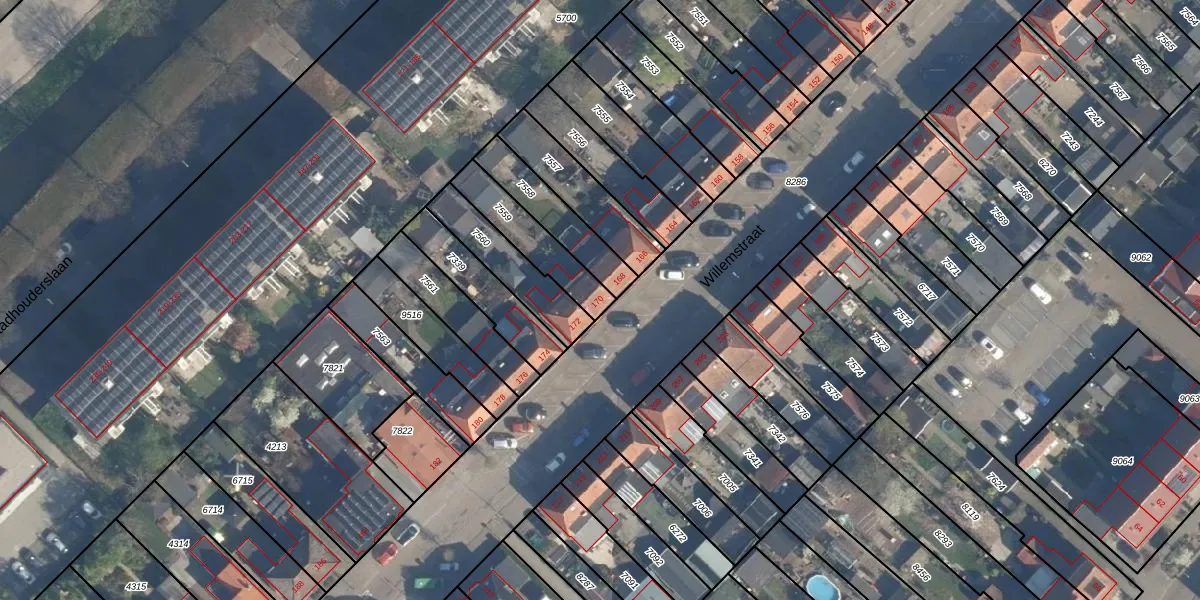 Het perceel waarop Willemstraat 170 staat heeft een oppervlakte van 182 m². Dit is een middelgroot perceel. De perceeloppervlakte wordt geregistreerd door het Kadaster. Gedetailleerde informatie over de maten van dit perceel kunt u vinden in het rapport Kadastrale kaart met maatvoering van Willemstraat 170.