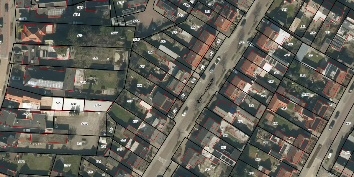 Het perceel waarop Bernhardstraat 19 staat heeft een oppervlakte van 310 m². Dit is een groot perceel. De perceeloppervlakte wordt geregistreerd door het Kadaster. Gedetailleerde informatie over de maten van dit perceel kunt u vinden in het rapport Kadastrale kaart met maatvoering van Bernhardstraat 19.