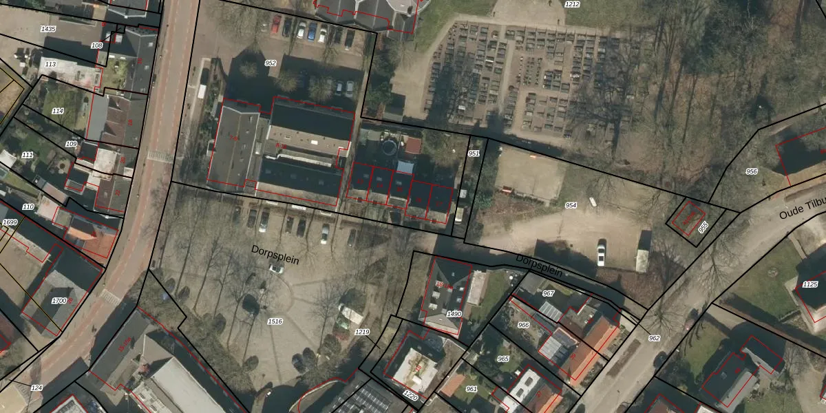 Dorpsplein 16 is gelegen op kadastraal perceel GLE01F952. Deze kadastrale aanduiding is uniek en wordt gebruikt door het Kadaster om eigendomsrechten en andere zakelijke rechten vast te leggen. Het perceel maakt onderdeel uit van de kadastrale gemeente Goirle.
