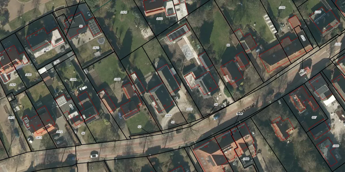 Het perceel waarop Kerkstraat 50 staat heeft een oppervlakte van 525 m². Dit is een groot perceel. De perceeloppervlakte wordt geregistreerd door het Kadaster. Gedetailleerde informatie over de maten van dit perceel kunt u vinden in het rapport Kadastrale kaart met maatvoering van Kerkstraat 50.