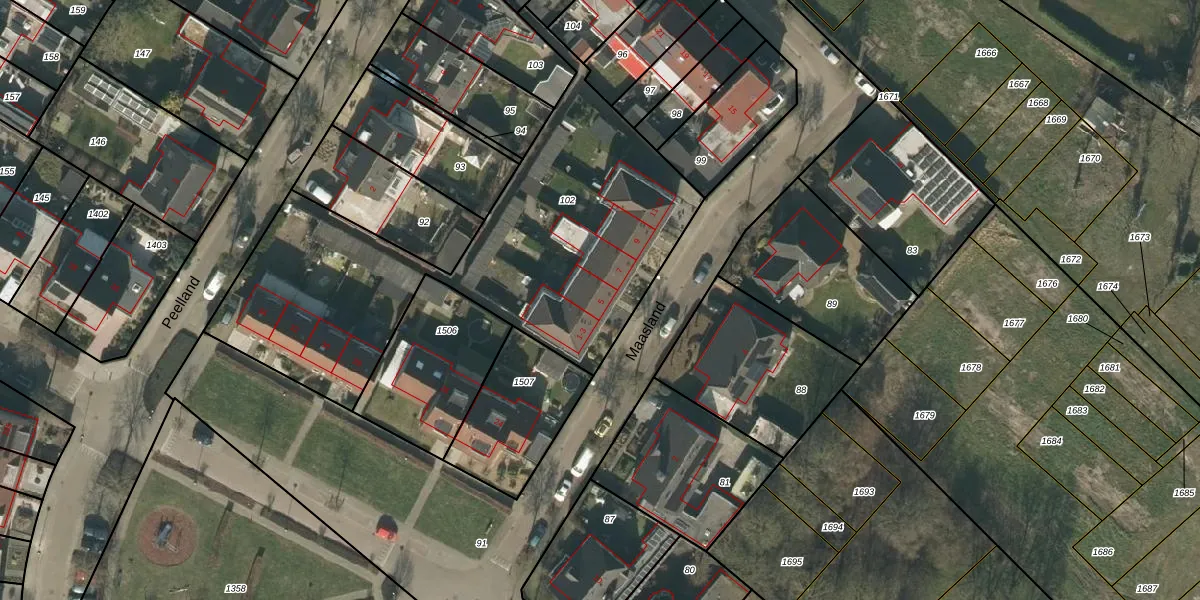 Maasland 5 is gelegen op kadastraal perceel GLE01F102. Deze kadastrale aanduiding is uniek en wordt gebruikt door het Kadaster om eigendomsrechten en andere zakelijke rechten vast te leggen. Het perceel maakt onderdeel uit van de kadastrale gemeente Goirle.