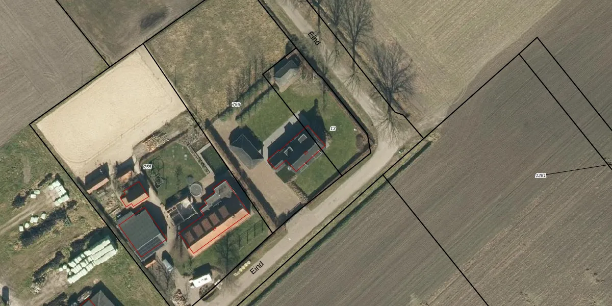 Het perceel waarop Eind 15 staat heeft een oppervlakte van 2365 m². Dit is een zeer groot perceel. De perceeloppervlakte wordt geregistreerd door het Kadaster. Gedetailleerde informatie over de maten van dit perceel kunt u vinden in het rapport Kadastrale kaart met maatvoering van Eind 15.