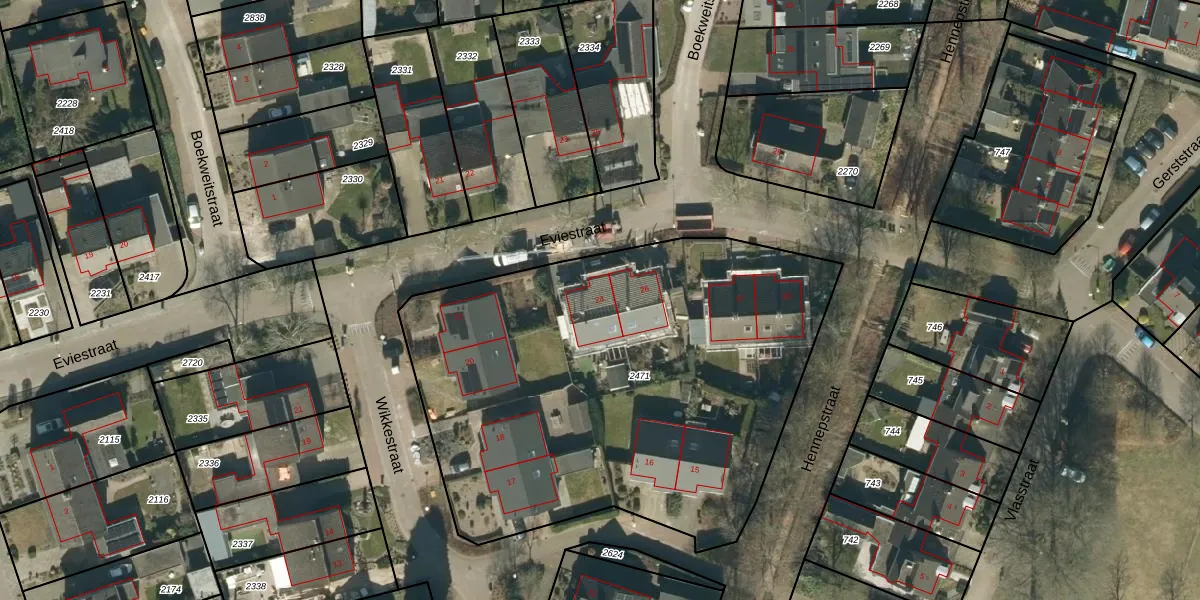 Eviestraat 24 is gelegen op kadastraal perceel RHV00B2471. Deze kadastrale aanduiding is uniek en wordt gebruikt door het Kadaster om eigendomsrechten en andere zakelijke rechten vast te leggen. Het perceel maakt onderdeel uit van de kadastrale gemeente Riethoven.
