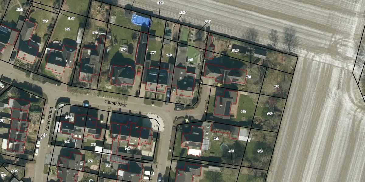 Gerststraat 25 is gelegen op kadastraal perceel RHV00E761. Deze kadastrale aanduiding is uniek en wordt gebruikt door het Kadaster om eigendomsrechten en andere zakelijke rechten vast te leggen. Het perceel maakt onderdeel uit van de kadastrale gemeente Riethoven.