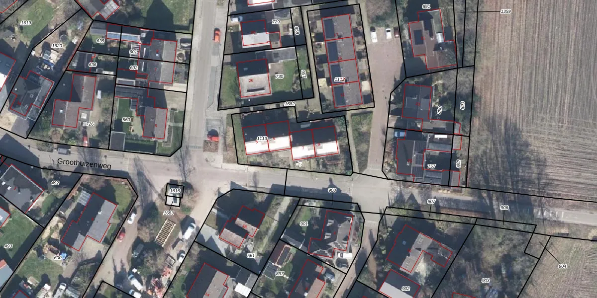 Groothuizenweg 7 is gelegen op kadastraal perceel NDE00H1113. Deze kadastrale aanduiding is uniek en wordt gebruikt door het Kadaster om eigendomsrechten en andere zakelijke rechten vast te leggen. Het perceel maakt onderdeel uit van de kadastrale gemeente Neede.