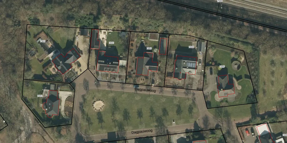 Het perceel waarop Dagpauwoog 7 staat heeft een oppervlakte van 996 m². Dit is een groot perceel. De perceeloppervlakte wordt geregistreerd door het Kadaster. Gedetailleerde informatie over de maten van dit perceel kunt u vinden in het rapport Kadastrale kaart met maatvoering van Dagpauwoog 7.