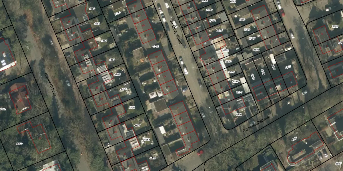 Het perceel waarop de Quaystraat 9 staat heeft een oppervlakte van 2587 m². Dit is een zeer groot perceel. De perceeloppervlakte wordt geregistreerd door het Kadaster. Gedetailleerde informatie over de maten van dit perceel kunt u vinden in het rapport Kadastrale kaart met maatvoering van de Quaystraat 9.