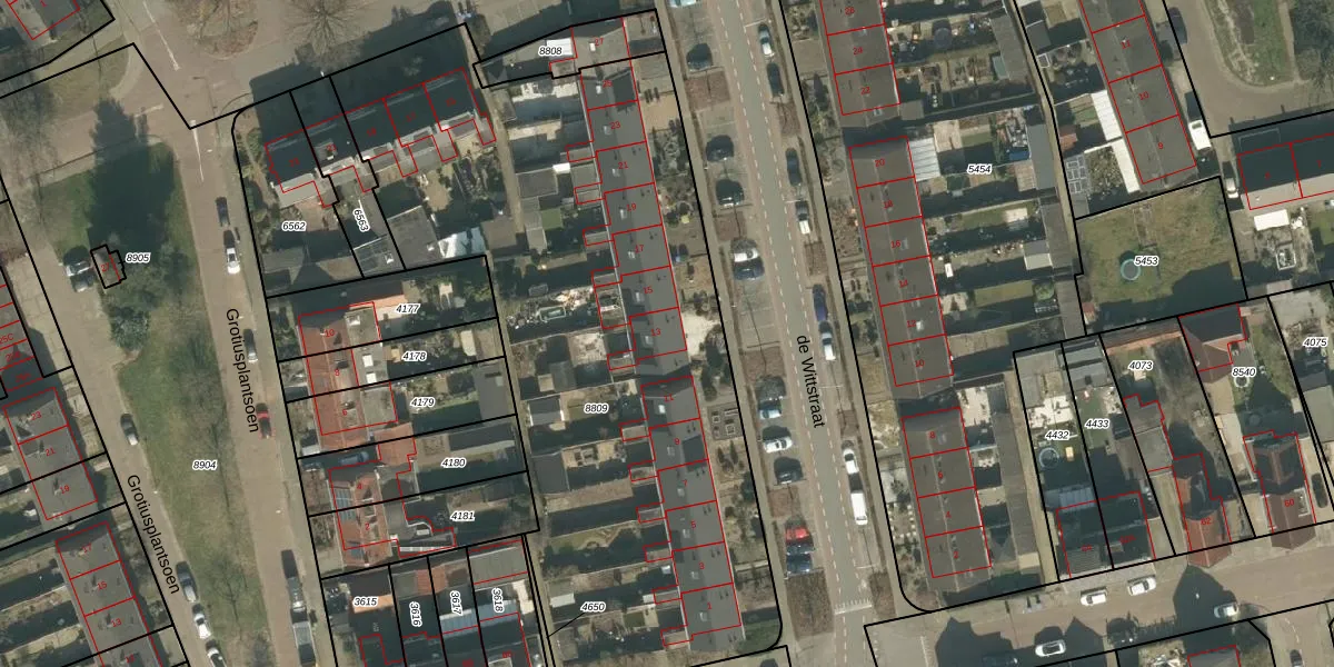 Het perceel waarop de Wittstraat 13 staat heeft een oppervlakte van 3550 m². Dit is een zeer groot perceel. De perceeloppervlakte wordt geregistreerd door het Kadaster. Gedetailleerde informatie over de maten van dit perceel kunt u vinden in het rapport Kadastrale kaart met maatvoering van de Wittstraat 13.