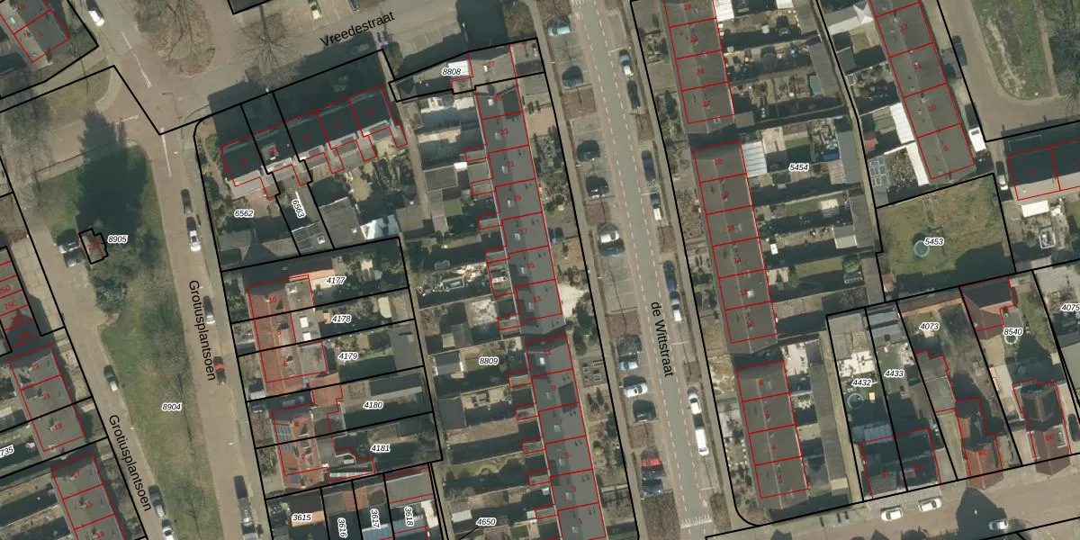 Het perceel waarop de Wittstraat 15 staat heeft een oppervlakte van 3550 m². Dit is een zeer groot perceel. De perceeloppervlakte wordt geregistreerd door het Kadaster. Gedetailleerde informatie over de maten van dit perceel kunt u vinden in het rapport Kadastrale kaart met maatvoering van de Wittstraat 15.