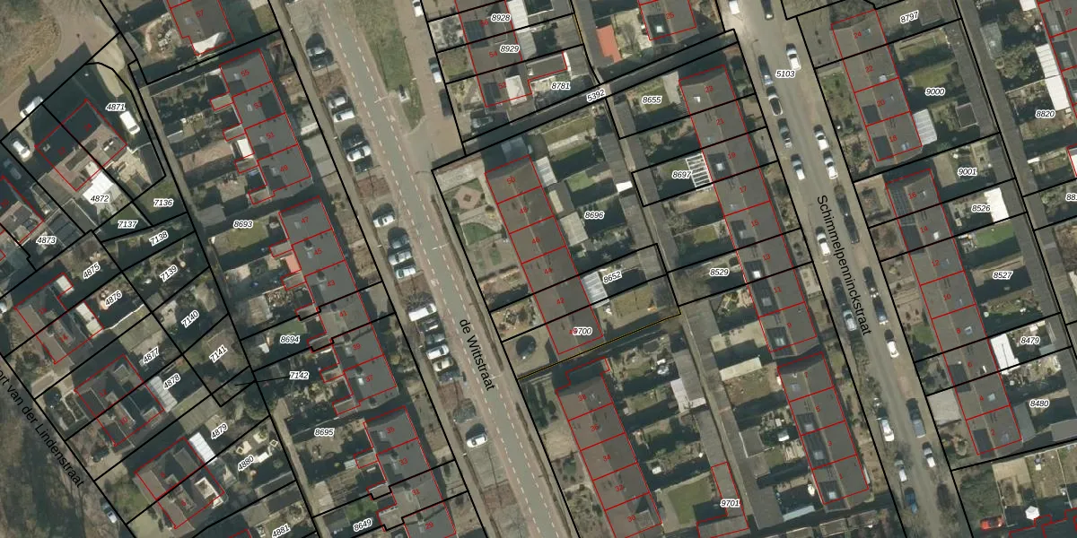Het perceel waarop de Wittstraat 44 staat heeft een oppervlakte van 1494 m². Dit is een zeer groot perceel. De perceeloppervlakte wordt geregistreerd door het Kadaster. Gedetailleerde informatie over de maten van dit perceel kunt u vinden in het rapport Kadastrale kaart met maatvoering van de Wittstraat 44.