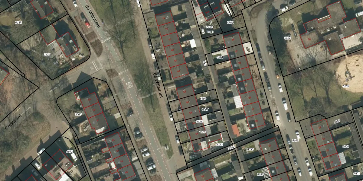 Het perceel waarop de Wittstraat 62 staat heeft een oppervlakte van 2995 m². Dit is een zeer groot perceel. De perceeloppervlakte wordt geregistreerd door het Kadaster. Gedetailleerde informatie over de maten van dit perceel kunt u vinden in het rapport Kadastrale kaart met maatvoering van de Wittstraat 62.
