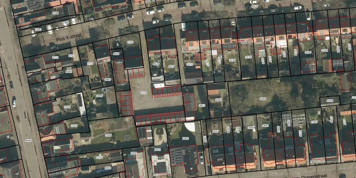 Het perceel waarop Pius X-straat 8-F staat heeft een oppervlakte van 962 m². Dit is een groot perceel. De perceeloppervlakte wordt geregistreerd door het Kadaster. Gedetailleerde informatie over de maten van dit perceel kunt u vinden in het rapport Kadastrale kaart met maatvoering van Pius X-straat 8-F.