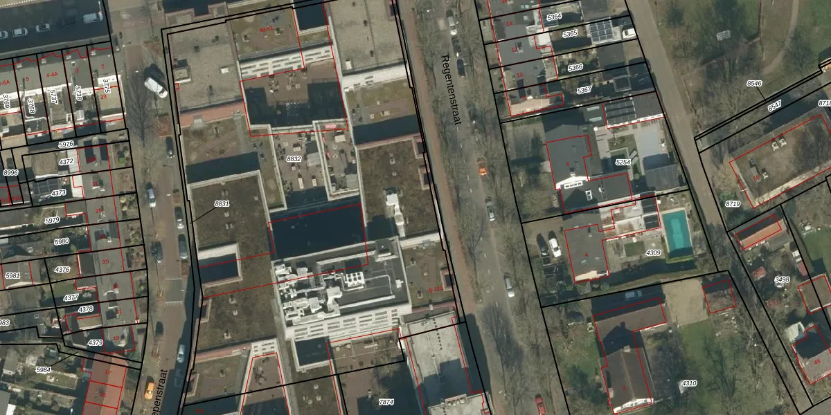Het perceel waarop Regentenstraat 57 staat heeft een oppervlakte van 5150 m². Dit is een zeer groot perceel. De perceeloppervlakte wordt geregistreerd door het Kadaster. Gedetailleerde informatie over de maten van dit perceel kunt u vinden in het rapport Kadastrale kaart met maatvoering van Regentenstraat 57.
