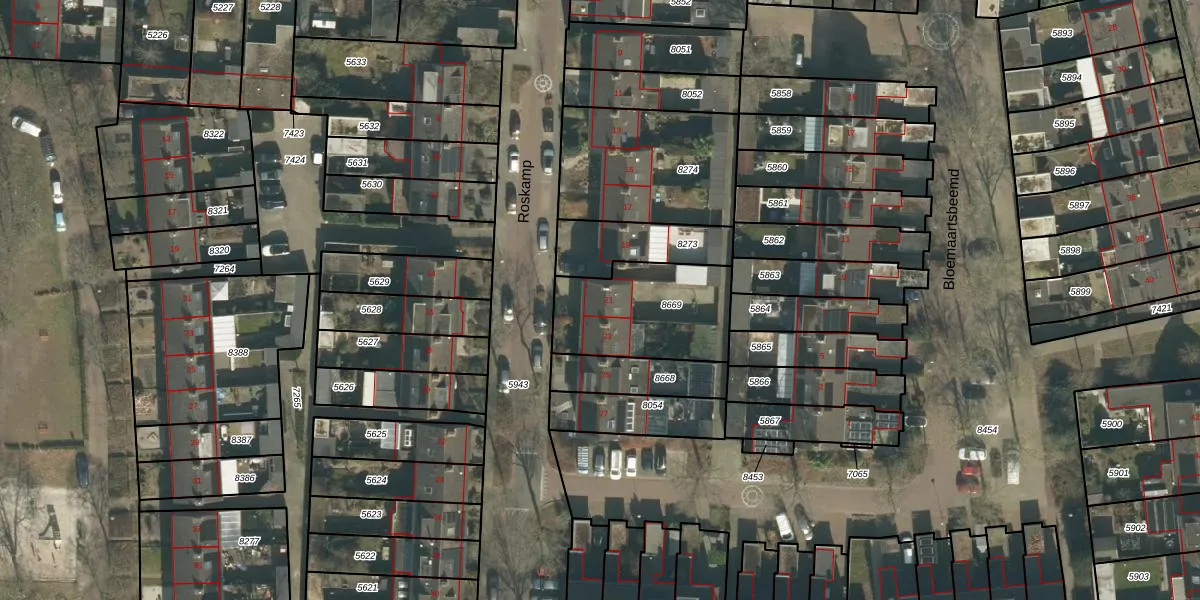 Het perceel waarop Roskamp 21 staat heeft een oppervlakte van 446 m². Dit is een groot perceel. De perceeloppervlakte wordt geregistreerd door het Kadaster. Gedetailleerde informatie over de maten van dit perceel kunt u vinden in het rapport Kadastrale kaart met maatvoering van Roskamp 21.