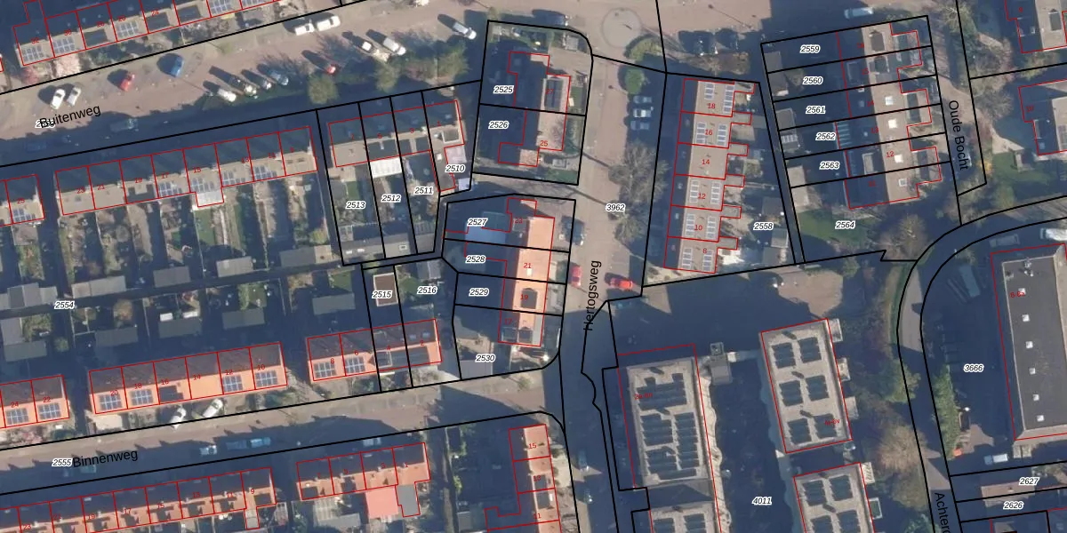 Gebruik de zoekbalk of klik op een perceel voor informatie over de adressen binnen dit perceel.