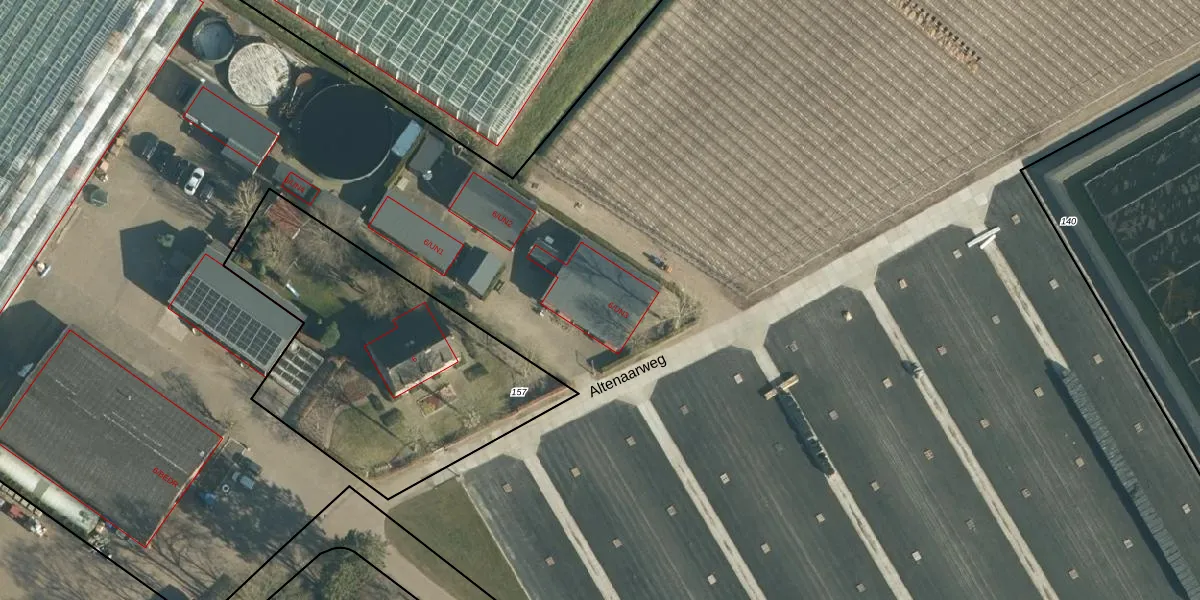 Het perceel waarop Altenaarweg 6-UN3 staat heeft een oppervlakte van 3,8 ha. Dit is een zeer groot perceel. De perceeloppervlakte wordt geregistreerd door het Kadaster. Gedetailleerde informatie over de maten van dit perceel kunt u vinden in het rapport Kadastrale kaart met maatvoering van Altenaarweg 6-UN3.