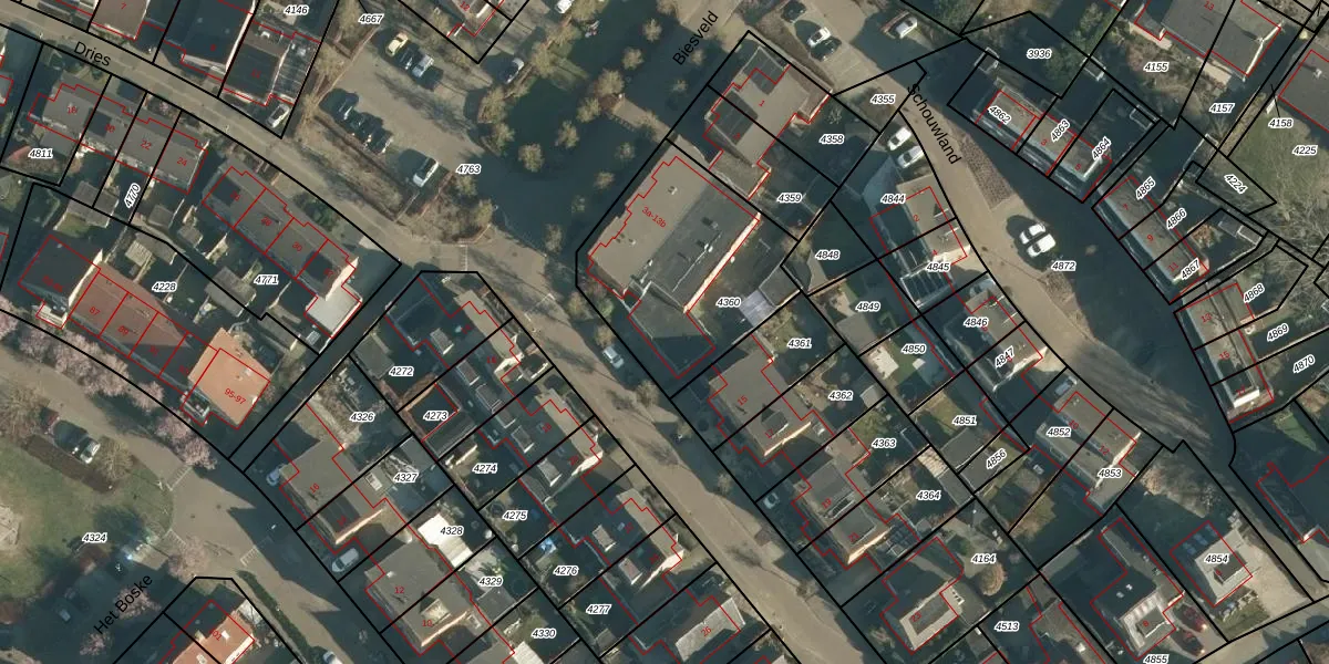 Biesveld 13 is gelegen op kadastraal perceel RBG01B4360. Deze kadastrale aanduiding is uniek en wordt gebruikt door het Kadaster om eigendomsrechten en andere zakelijke rechten vast te leggen. Het perceel maakt onderdeel uit van de kadastrale gemeente Rijsbergen.