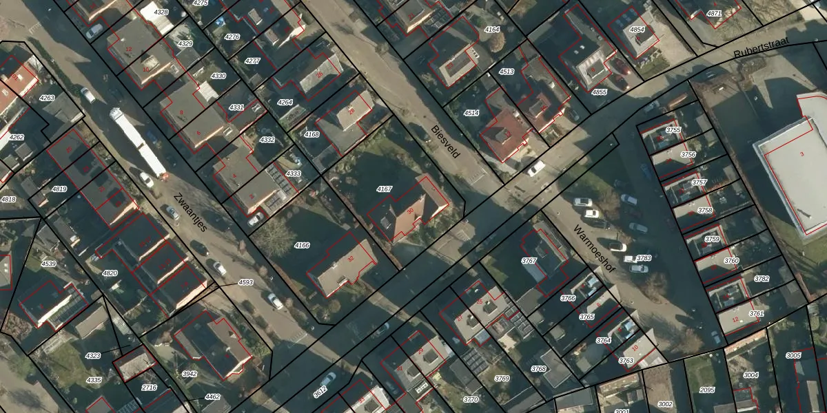 Biesveld 30 is gelegen op kadastraal perceel RBG01B4167. Deze kadastrale aanduiding is uniek en wordt gebruikt door het Kadaster om eigendomsrechten en andere zakelijke rechten vast te leggen. Het perceel maakt onderdeel uit van de kadastrale gemeente Rijsbergen.
