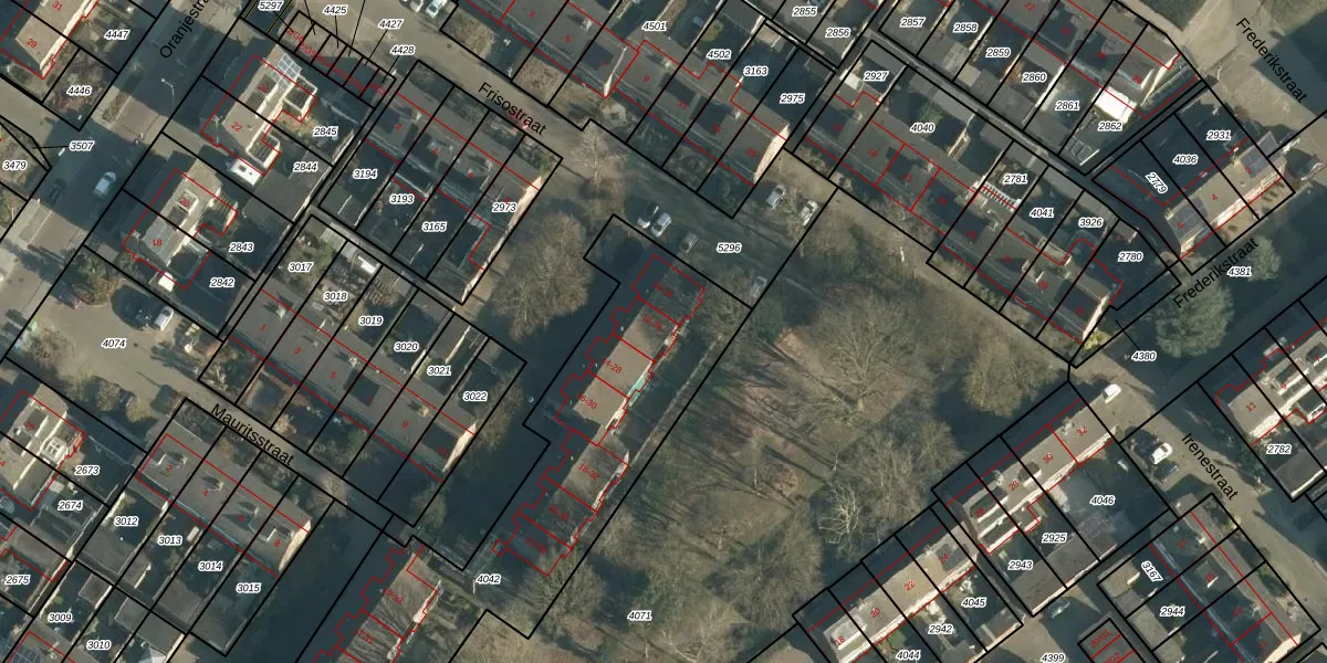 Het perceel waarop Frisostraat 26 staat heeft een oppervlakte van 2040 m². Dit is een zeer groot perceel. De perceeloppervlakte wordt geregistreerd door het Kadaster. Gedetailleerde informatie over de maten van dit perceel kunt u vinden in het rapport Kadastrale kaart met maatvoering van Frisostraat 26.