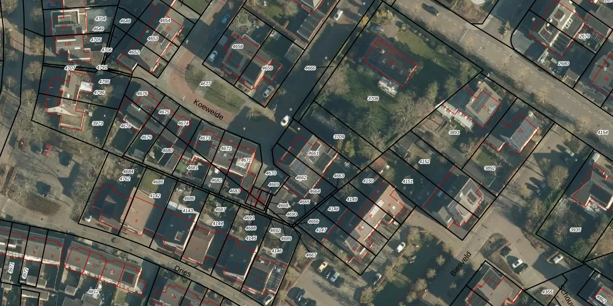 Koeweide 1 is gelegen op kadastraal perceel RBG01B4661. Deze kadastrale aanduiding is uniek en wordt gebruikt door het Kadaster om eigendomsrechten en andere zakelijke rechten vast te leggen. Het perceel maakt onderdeel uit van de kadastrale gemeente Rijsbergen.