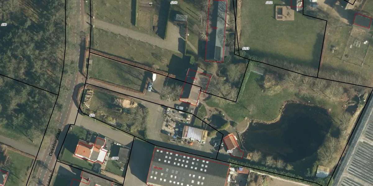 Het perceel waarop Oekelsestraat 7-a staat heeft een oppervlakte van 4966 m². Dit is een zeer groot perceel. De perceeloppervlakte wordt geregistreerd door het Kadaster. Gedetailleerde informatie over de maten van dit perceel kunt u vinden in het rapport Kadastrale kaart met maatvoering van Oekelsestraat 7-a.