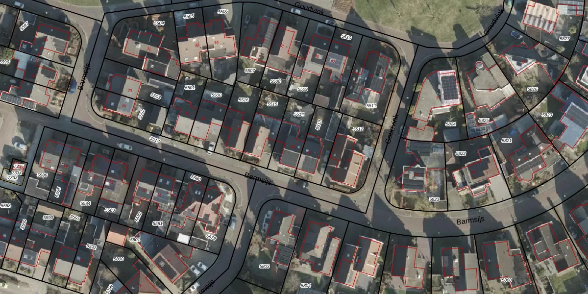 Het perceel waarop Barmsijs 45 staat heeft een oppervlakte van 242 m². Dit is een middelgroot perceel. De perceeloppervlakte wordt geregistreerd door het Kadaster. Gedetailleerde informatie over de maten van dit perceel kunt u vinden in het rapport Kadastrale kaart met maatvoering van Barmsijs 45.