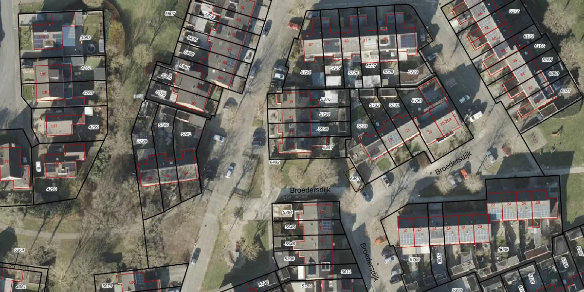 Het perceel waarop Broedersdijk 45 staat heeft een oppervlakte van 196 m². Dit is een middelgroot perceel. De perceeloppervlakte wordt geregistreerd door het Kadaster. Gedetailleerde informatie over de maten van dit perceel kunt u vinden in het rapport Kadastrale kaart met maatvoering van Broedersdijk 45.