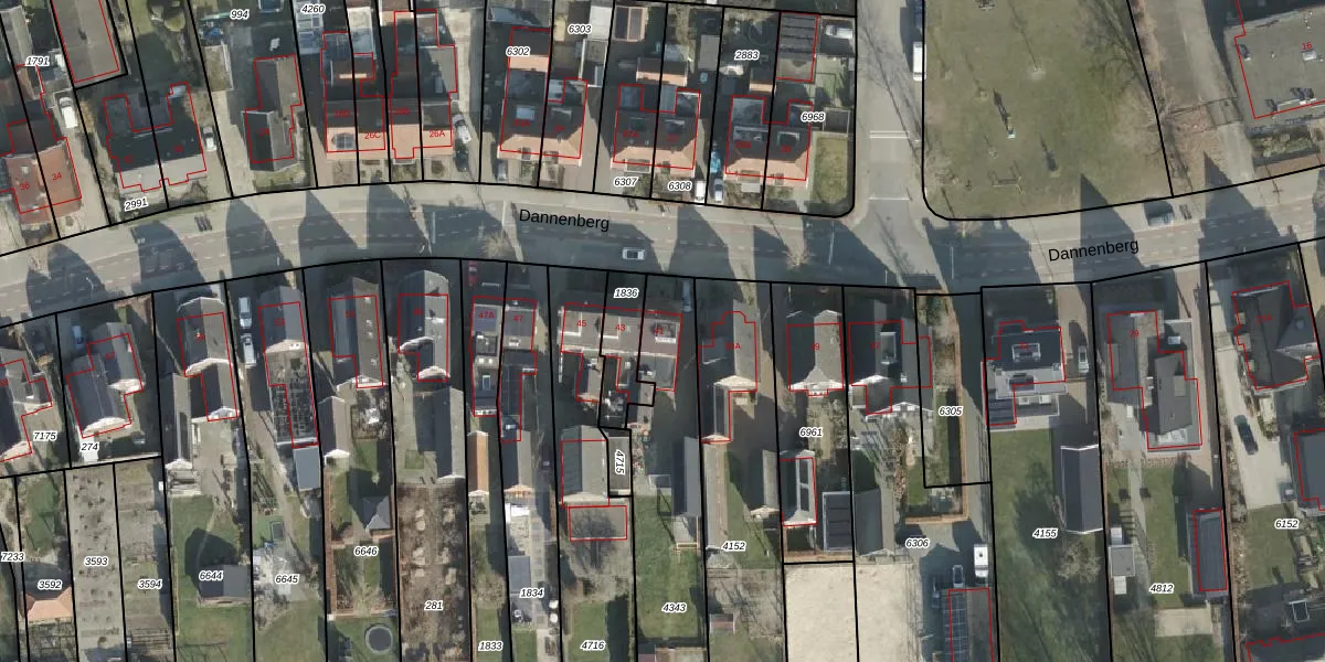 Het perceel waarop Dannenberg 41 staat heeft een oppervlakte van 935 m². Dit is een groot perceel. De perceeloppervlakte wordt geregistreerd door het Kadaster. Gedetailleerde informatie over de maten van dit perceel kunt u vinden in het rapport Kadastrale kaart met maatvoering van Dannenberg 41.