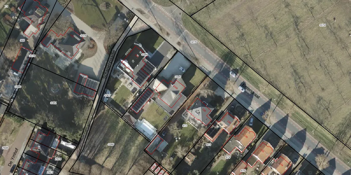 Het perceel waarop Enterstraat 124-A staat heeft een oppervlakte van 1100 m². Dit is een zeer groot perceel. De perceeloppervlakte wordt geregistreerd door het Kadaster. Gedetailleerde informatie over de maten van dit perceel kunt u vinden in het rapport Kadastrale kaart met maatvoering van Enterstraat 124-A.