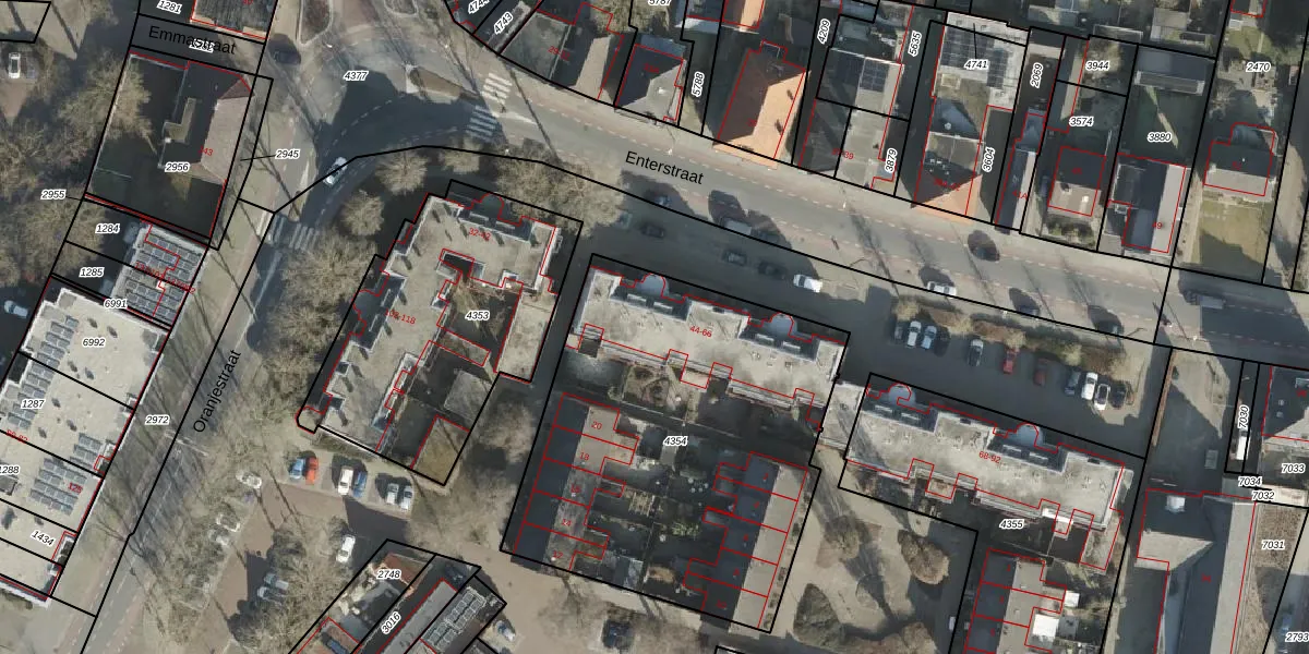 Het perceel waarop Enterstraat 50 staat heeft een oppervlakte van 2006 m². Dit is een zeer groot perceel. De perceeloppervlakte wordt geregistreerd door het Kadaster. Gedetailleerde informatie over de maten van dit perceel kunt u vinden in het rapport Kadastrale kaart met maatvoering van Enterstraat 50.