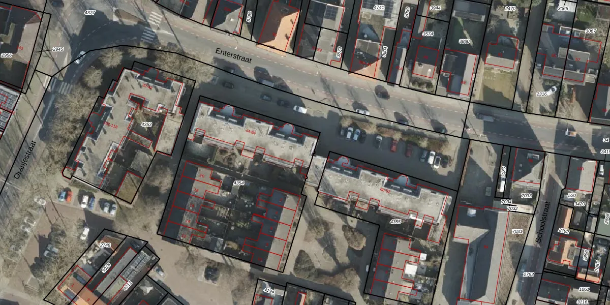 Het perceel waarop Enterstraat 64 staat heeft een oppervlakte van 2006 m². Dit is een zeer groot perceel. De perceeloppervlakte wordt geregistreerd door het Kadaster. Gedetailleerde informatie over de maten van dit perceel kunt u vinden in het rapport Kadastrale kaart met maatvoering van Enterstraat 64.
