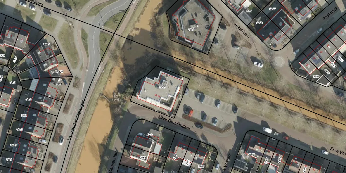 Het perceel waarop Erve Geusendam 45 staat heeft een oppervlakte van 625 m². Dit is een groot perceel. De perceeloppervlakte wordt geregistreerd door het Kadaster. Gedetailleerde informatie over de maten van dit perceel kunt u vinden in het rapport Kadastrale kaart met maatvoering van Erve Geusendam 45.