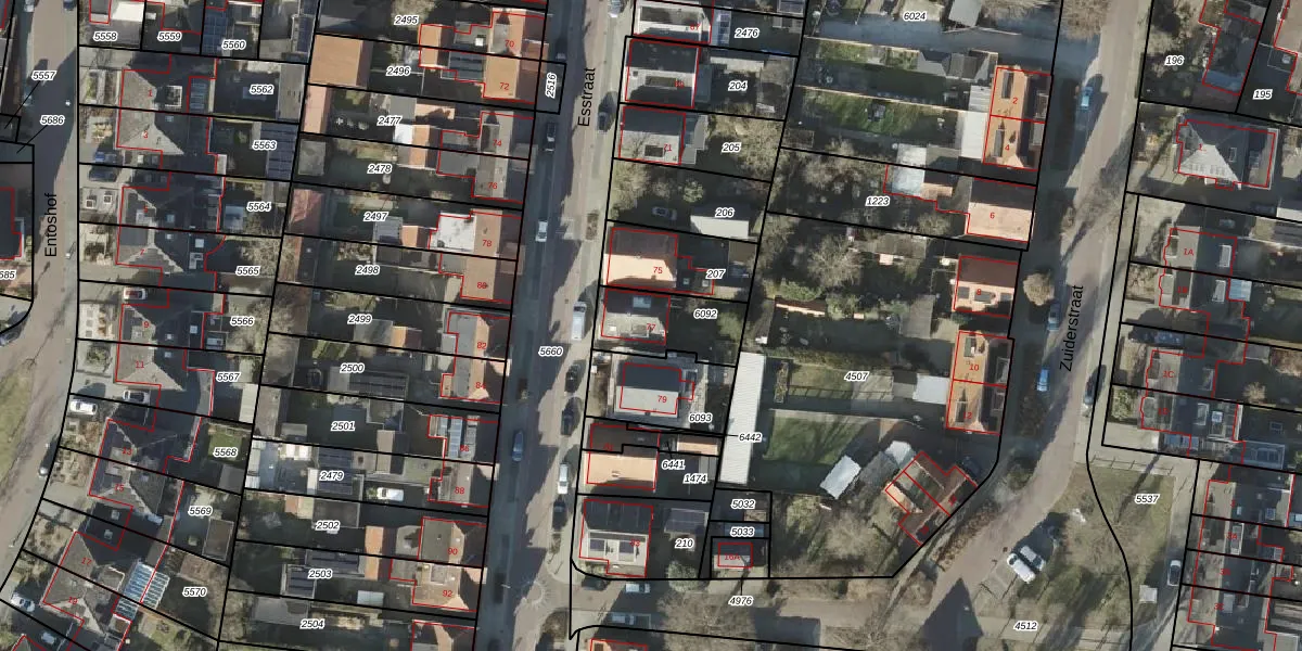 Het perceel waarop Esstraat 77 staat heeft een oppervlakte van 221 m². Dit is een middelgroot perceel. De perceeloppervlakte wordt geregistreerd door het Kadaster. Gedetailleerde informatie over de maten van dit perceel kunt u vinden in het rapport Kadastrale kaart met maatvoering van Esstraat 77.