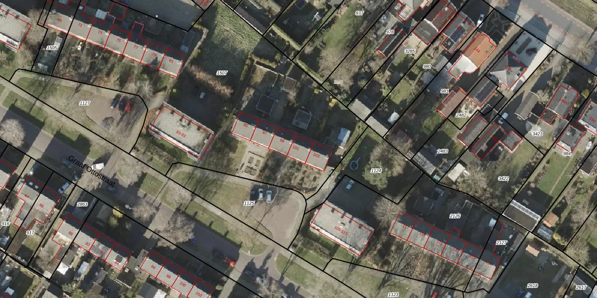 Het perceel waarop Graaf Ottostraat 101 staat heeft een oppervlakte van 3940 m². Dit is een zeer groot perceel. De perceeloppervlakte wordt geregistreerd door het Kadaster. Gedetailleerde informatie over de maten van dit perceel kunt u vinden in het rapport Kadastrale kaart met maatvoering van Graaf Ottostraat 101.