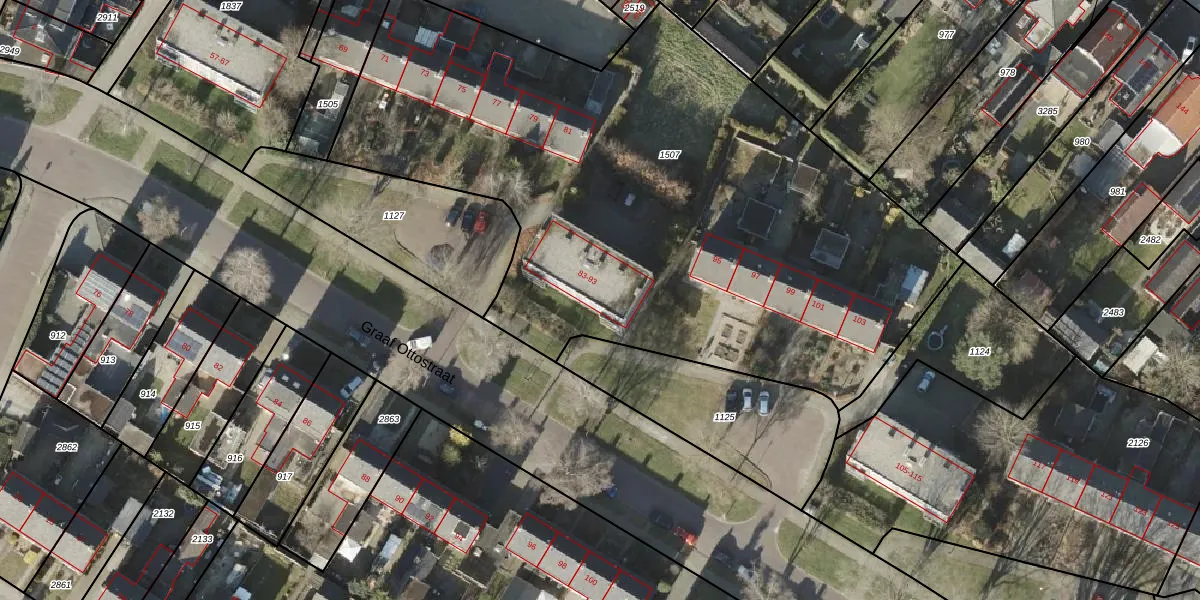 Het perceel waarop Graaf Ottostraat 91 staat heeft een oppervlakte van 3940 m². Dit is een zeer groot perceel. De perceeloppervlakte wordt geregistreerd door het Kadaster. Gedetailleerde informatie over de maten van dit perceel kunt u vinden in het rapport Kadastrale kaart met maatvoering van Graaf Ottostraat 91.