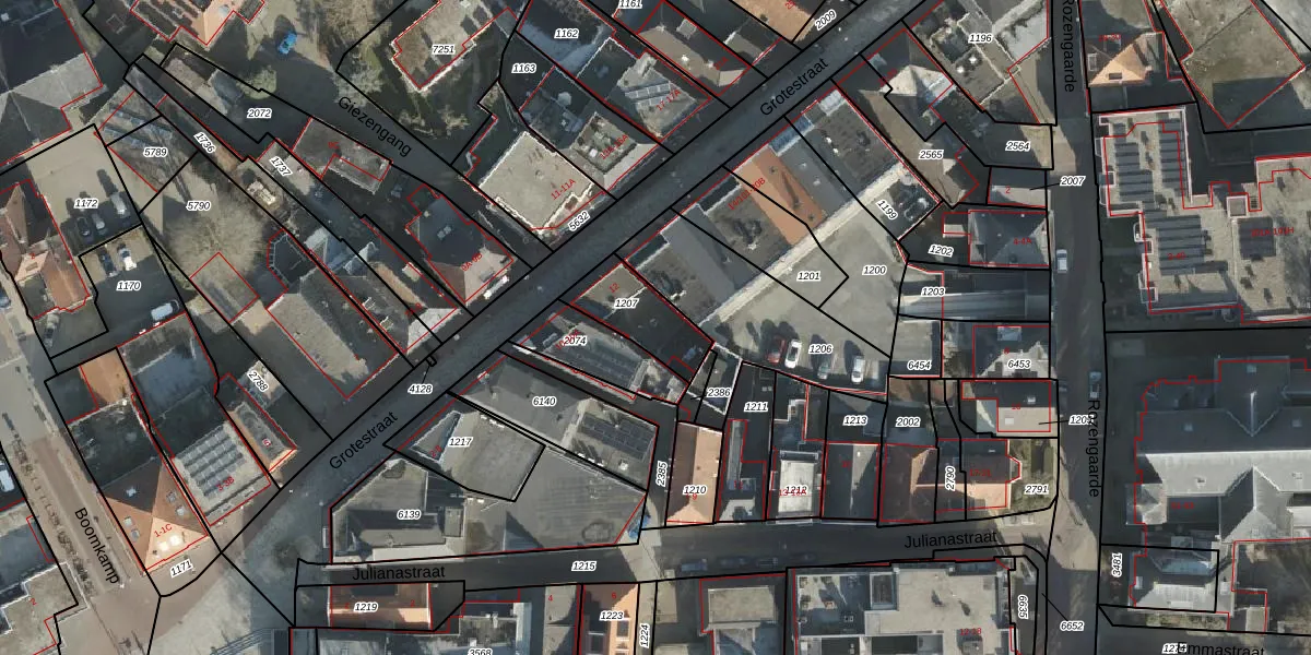 Het perceel waarop Grotestraat 12 staat heeft een oppervlakte van 188 m². Dit is een middelgroot perceel. De perceeloppervlakte wordt geregistreerd door het Kadaster. Gedetailleerde informatie over de maten van dit perceel kunt u vinden in het rapport Kadastrale kaart met maatvoering van Grotestraat 12.