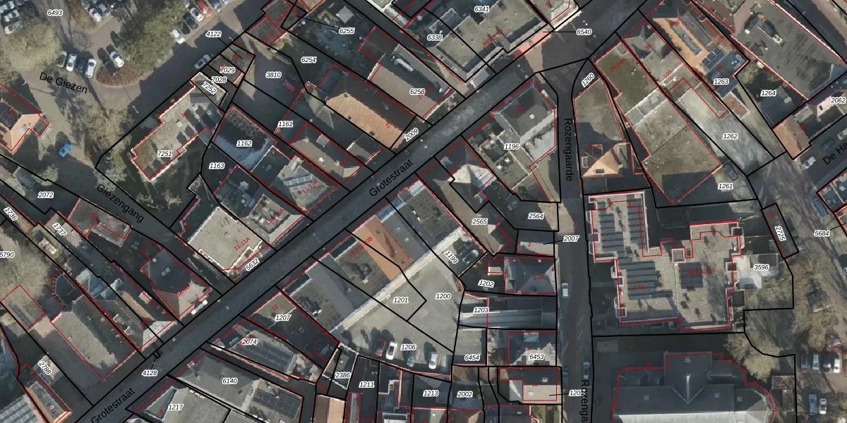 Grotestraat 14-106 is gelegen op kadastraal perceel RSN01F1199. Deze kadastrale aanduiding is uniek en wordt gebruikt door het Kadaster om eigendomsrechten en andere zakelijke rechten vast te leggen. Het perceel maakt onderdeel uit van de kadastrale gemeente Rijssen.