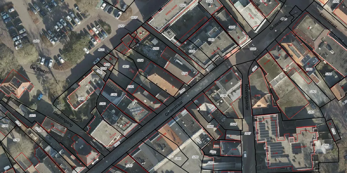 Het perceel waarop Grotestraat 25 staat heeft een oppervlakte van 393 m². Dit is een groot perceel. De perceeloppervlakte wordt geregistreerd door het Kadaster. Gedetailleerde informatie over de maten van dit perceel kunt u vinden in het rapport Kadastrale kaart met maatvoering van Grotestraat 25.