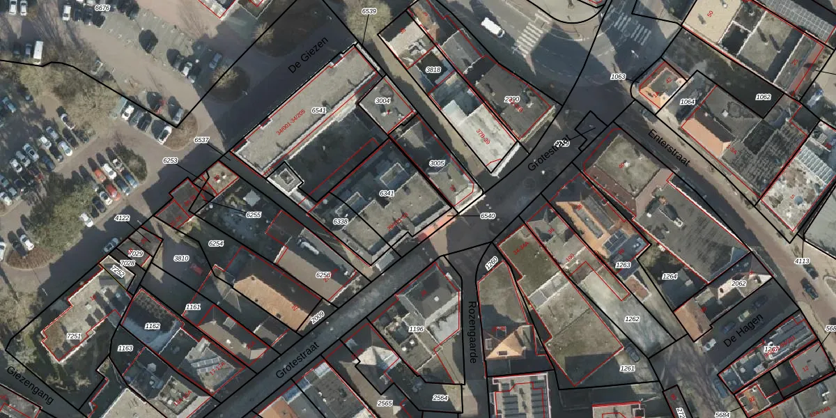 Grotestraat 33 is gelegen op kadastraal perceel RSN01F6341. Deze kadastrale aanduiding is uniek en wordt gebruikt door het Kadaster om eigendomsrechten en andere zakelijke rechten vast te leggen. Het perceel maakt onderdeel uit van de kadastrale gemeente Rijssen.