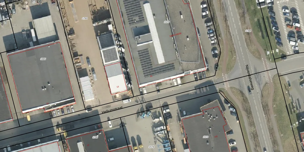 Het perceel waarop Heliumstraat 15 staat heeft een oppervlakte van 5002 m². Dit is een zeer groot perceel. De perceeloppervlakte wordt geregistreerd door het Kadaster. Gedetailleerde informatie over de maten van dit perceel kunt u vinden in het rapport Kadastrale kaart met maatvoering van Heliumstraat 15.