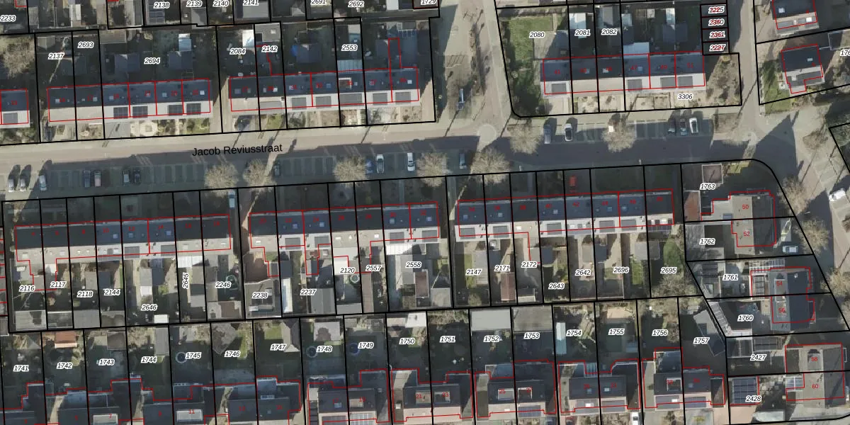 Het perceel waarop Jacob Reviusstraat 32 staat heeft een oppervlakte van 476 m². Dit is een groot perceel. De perceeloppervlakte wordt geregistreerd door het Kadaster. Gedetailleerde informatie over de maten van dit perceel kunt u vinden in het rapport Kadastrale kaart met maatvoering van Jacob Reviusstraat 32.