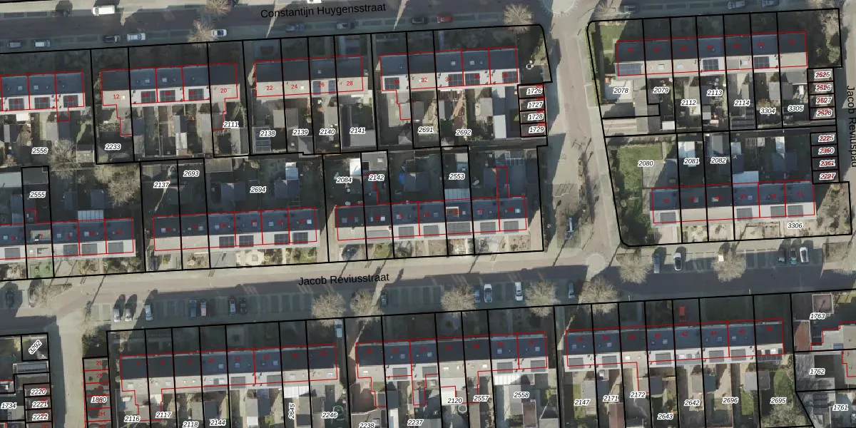 Het perceel waarop Jacob Reviusstraat 33 staat heeft een oppervlakte van 1591 m². Dit is een zeer groot perceel. De perceeloppervlakte wordt geregistreerd door het Kadaster. Gedetailleerde informatie over de maten van dit perceel kunt u vinden in het rapport Kadastrale kaart met maatvoering van Jacob Reviusstraat 33.