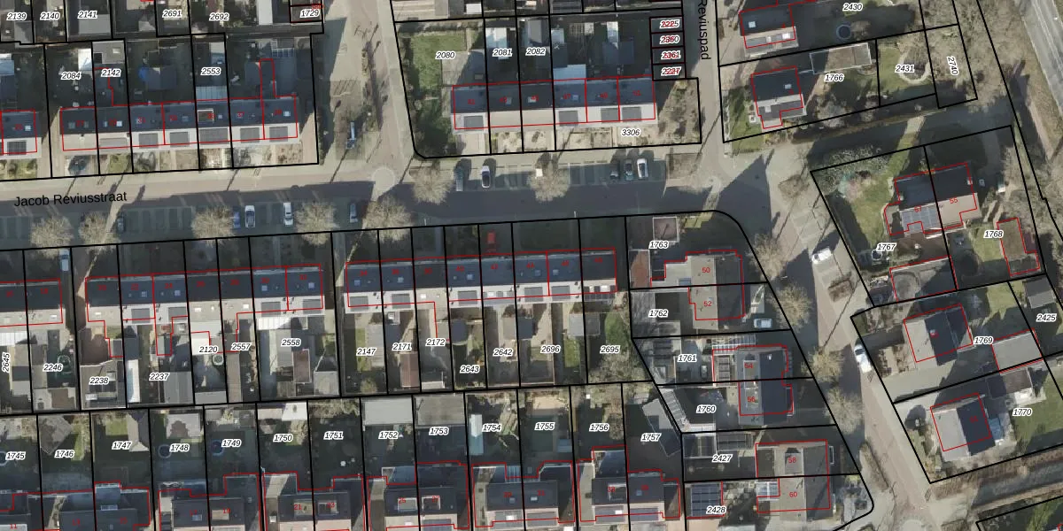 Het perceel waarop Jacob Reviusstraat 44 staat heeft een oppervlakte van 408 m². Dit is een groot perceel. De perceeloppervlakte wordt geregistreerd door het Kadaster. Gedetailleerde informatie over de maten van dit perceel kunt u vinden in het rapport Kadastrale kaart met maatvoering van Jacob Reviusstraat 44.