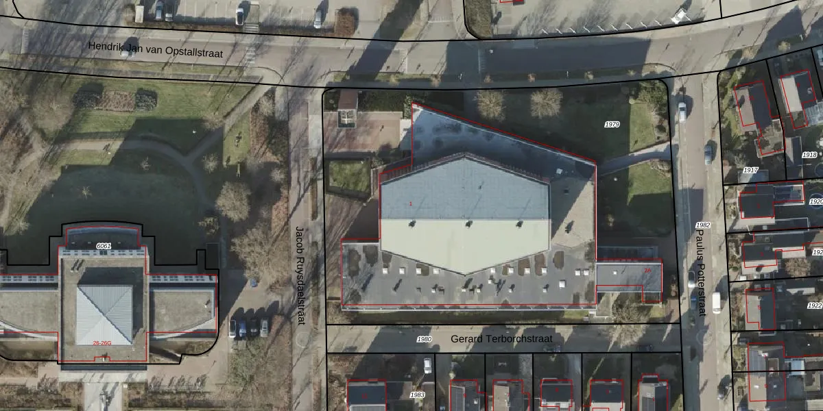Jacob Ruysdaelstraat 1 is gelegen op kadastraal perceel RSN01H1979. Deze kadastrale aanduiding is uniek en wordt gebruikt door het Kadaster om eigendomsrechten en andere zakelijke rechten vast te leggen. Het perceel maakt onderdeel uit van de kadastrale gemeente Rijssen.