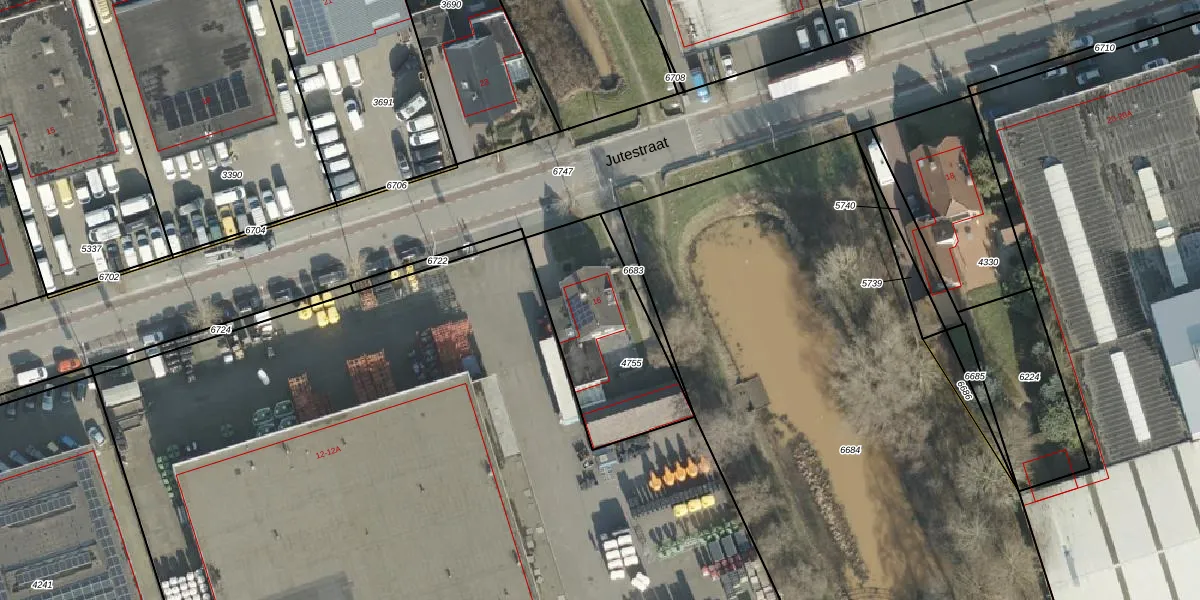 Het perceel waarop Jutestraat 16 staat heeft een oppervlakte van 575 m². Dit is een groot perceel. De perceeloppervlakte wordt geregistreerd door het Kadaster. Gedetailleerde informatie over de maten van dit perceel kunt u vinden in het rapport Kadastrale kaart met maatvoering van Jutestraat 16.