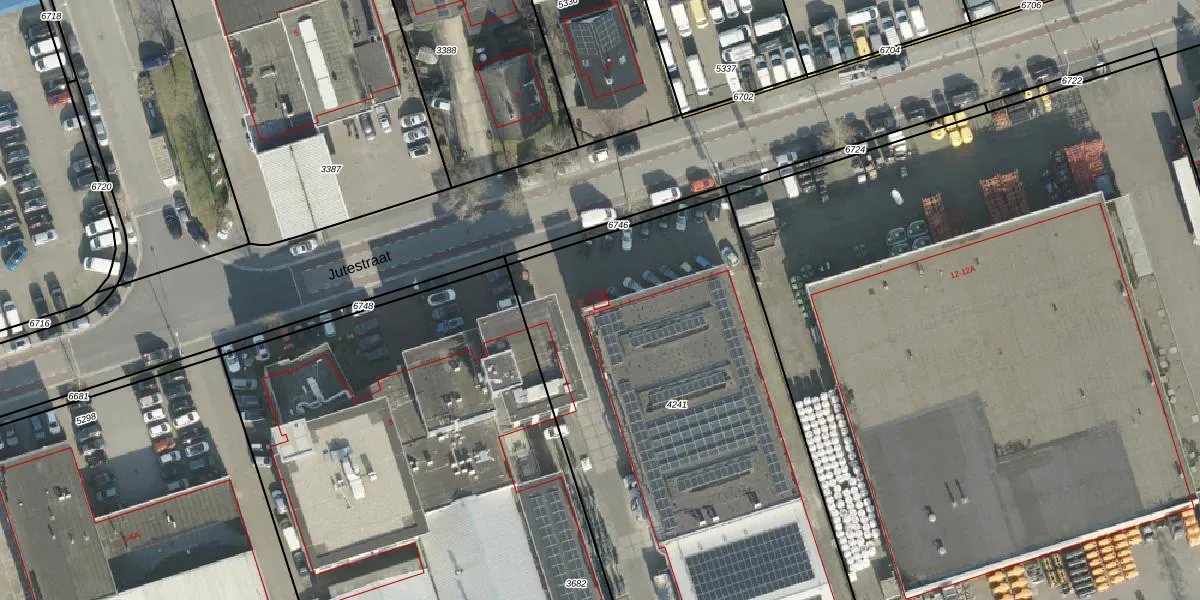 Het perceel waarop Jutestraat 8-A staat heeft een oppervlakte van 3855 m². Dit is een zeer groot perceel. De perceeloppervlakte wordt geregistreerd door het Kadaster. Gedetailleerde informatie over de maten van dit perceel kunt u vinden in het rapport Kadastrale kaart met maatvoering van Jutestraat 8-A.